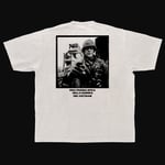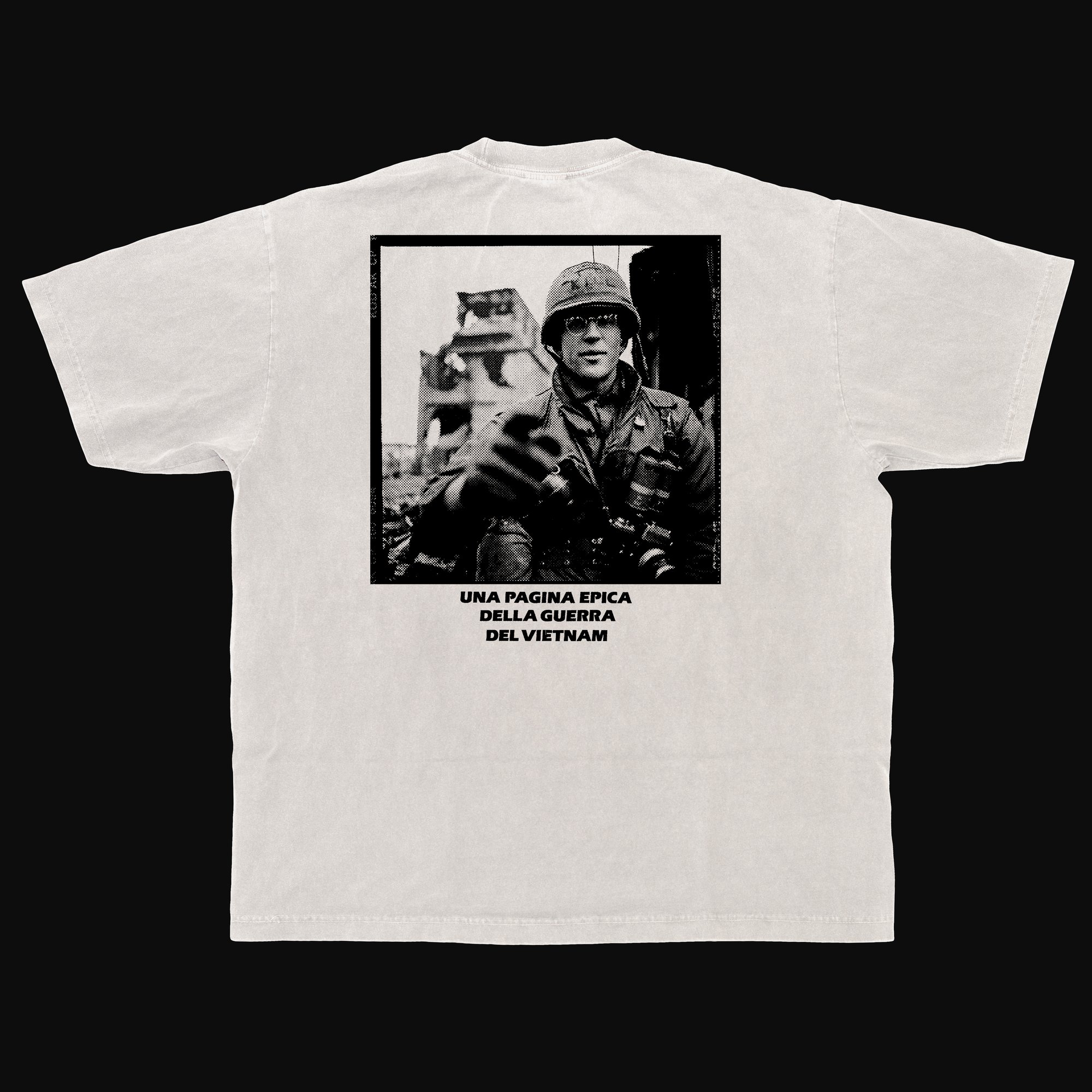 Screen printed on 6.5 oz Off-White 1801 t-shirts. Knitted, cut, sewn, and dyed in Los Angeles, California.
