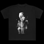 Screen printed on 6.5 oz Black Edge 1801 t-shirts. Knitted, cut, sewn, and dyed in Los Angeles, California.